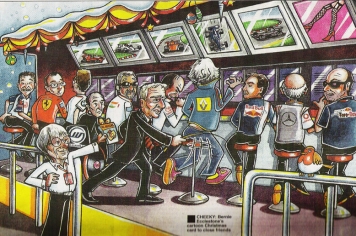 F1 autosacīkšu šefs Bērnijs Eklstons kārtējo reizi daudzus sasmīdinājis ar savu Ziemassvētku apsveikuma kartiņu. Šīgada kartiņā redzams līdzšinējais FIA prezidents Makss Moslijs, BMW Mario Teisens un Toyota Džons Hovets, kas ar burulaivu dodas pretī saulrietam, kamēr konkurējošo F1 komandu vadītāji stāv krastā un māj ardievas.