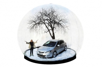 Tiesa gan, šajā objektā ir īsts Opel Astra, bet lode, kuras diametrs ir pieci metri, piepildīta ar 50 maisiem mākslīgā sniega.
