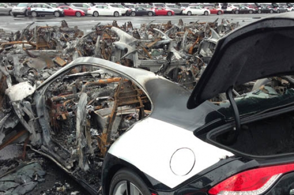 Fisker to gan nav apliecinājuši, taču mūsu rīcībā ir foto, kur redzami vairāki pilnībā sadeguši Fisker Karma sporta auto.