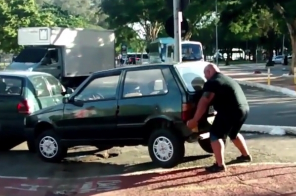 Daudz nedomājot, spēkavīrs vienkārši pacēla auto un nolika tam paredzētajā
