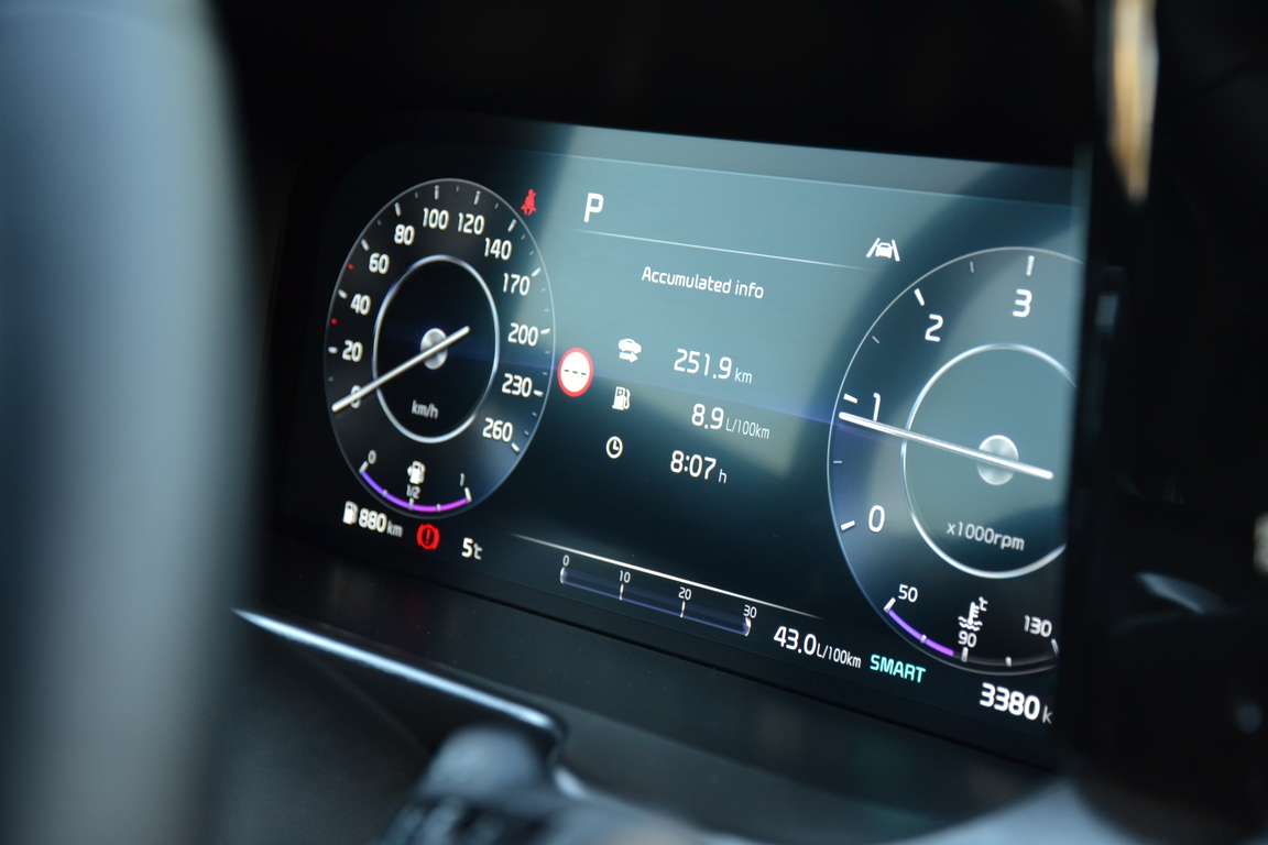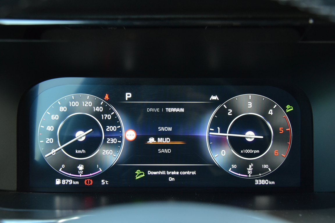 Mūsu Kia dīleri piedāvā tikai dārgāko Sorento komplektāciju TX, tādēļ aiz stūres zaigo pilnībā animēts 12,3 collu ekrāns, ko papildina 10,25" centrālais ekrāns. Lai gan Kia piedāvā vairākus mērskalu dizainus atbilstoši izvēlētajam braukšanas režīmam, pietrūkst iespējas izvērst pa visu ekrānu navigācijas karti kā to spēj līdzīgu SUV "softi". Toties griežoties un pārkārtojoties displejā paši no sevis iznirst apaļi logi, kuros redzams attēls no sānskata kamerām. Neparasti un noderīgi.