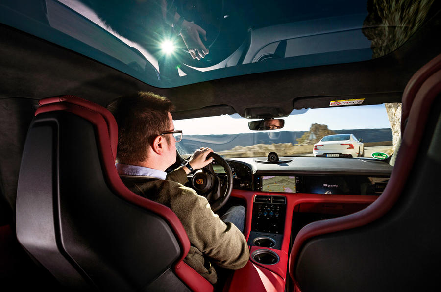 Bet atšķirībā no jebkura cita elektriskā piedāvājuma, kas līdz šim redzēts šajā embrija stadijā esošā tirgus nišā, Taycan vadāmība ir tikpat laba kā tā dinamika, turklāt tas ļoti labi bremzē. Un tas klausa stūrei tik labi kā jebkurš cits Porsche, varbūt neskaitot GT nodaļas īpašos auto. Tas līkumo bez sasvēršanās, stingri ieķeras asfaltā un strikti kontrolē virsbūves svārstības, vismaz līdz jūs sasniedzat ļoti lielu ātrumu. Turklāt tas pamanās sniegt tādu sabalansētību un vadāmības nosvērtību līkumos, ko jūs drīzāk gaidītu no 1500 kg sporta auto ar motoru vidū.