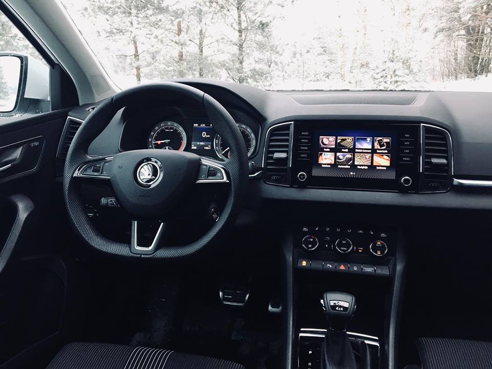 Karoq interjers ieturēts Škoda tradīcijās – viss ir ērti, praktiski un bez liekas greznības, taču nepieciešamības gadījumā to var papildināt ar tādu aprīkojumu, kas pat dažiem askētiskāko Tiguan īpašniekiem liks kļūt zaļiem no skaudības. Tajā ir gan Audi Virtual Cockpit iedvesmots digitālais mērinstrumentu bloks, gan skārienjutīga stikla infosistēmas ekrāns priekšējā paneļa vidū – 8,0 vai 9,2 collu izmērā. Papildaprīkojumā pieejami arī VarioFlex aizmugurējie sēdekļi, kurus var pat izņemt, tādā veidā ļaujot vēl vairāk palielināt Karoq kravas telpas plašumu. Tuvu maksimālajai komplektācijai bija arī Škoda Karoq, ko izmēģinājām šajā testa braucienā.